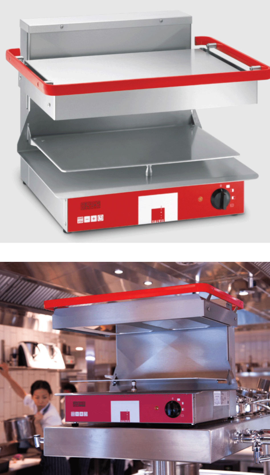 Automatic plate detection: The switchable clever function detects plates and bowls on its own and switches the Salamander on and off automatically. Due to the quick heating systems, you will save precious energy when cooking ‘au gratin’.