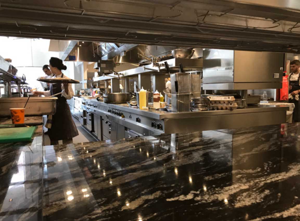 The MKN cooking island for the Glass Brasserie Kitchen was custom-manufactured in Wolfenbüttel, Germany, and shipped to Australia prior to installation. The suite comprises 3 gas target tops, 2 lava stone grills, 6 gas burners, 2 deep fat fryers, 2 pasta cookers, 2 griddles, a pot shelf with an MKN combi oven and a MKN salamander.