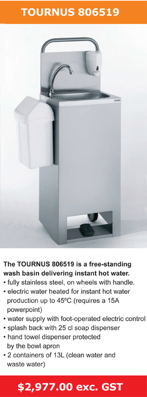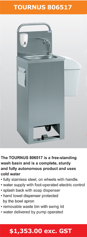 We have 2 models available. The 806517 uses cold water only, the 806519 features instant hot water and requires a 15A powerpoint. Both are mobile and do not require connection to water or drains. Both include a soap dispenser, paper towel roll and paper bin.
