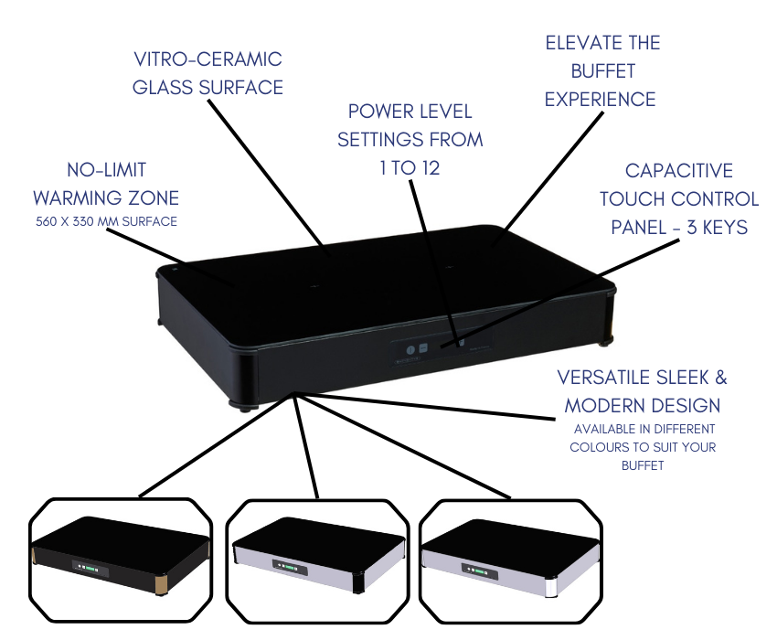 The Adventys Hot Plate is available in a variety of colours, allowing you to perfectly align the unit with your buffet decor or brand aesthetic. Whether your buffet is sleek and modern, classic and elegant or vibrant and playful, there's a finish to complement the look. This flexibility ensures the hot plate not only performs flawlessly but also enhances the overall presentation, creating a cohesive and visually appealing buffet experience for your guests. Its professional performance with a personalised touch.