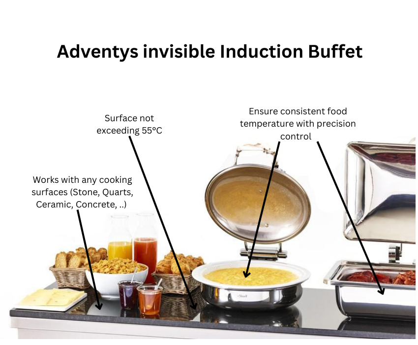This hassle free system allows venues to switch between dishes and configurations effortlessly, giving you the freedom to serve exactly the way you need. And if you prefer, compatible chafing dishes are also available for purchase directly from Phoeniks, making the Adventys Induc'Stone a truly flexible solution for any buffet, event or hospitality setting.