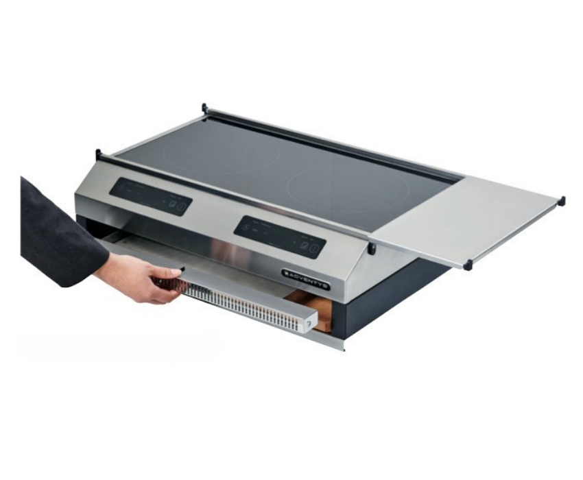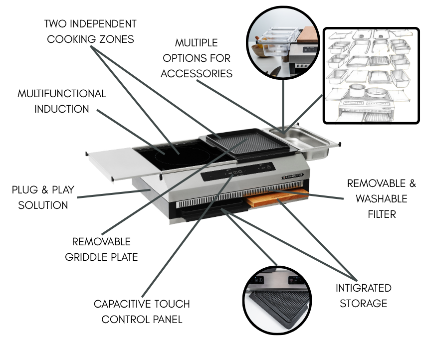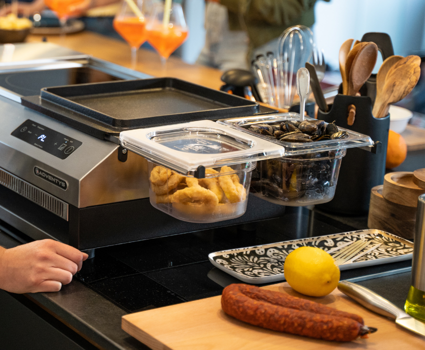 Adventys Octopus features two high-performance induction cooking zones, each equipped with its own capacitive touch control for fully independent operation. This setup allows chefs to cook multiple dishes simultaneously with precise temperature and power adjustments on each zone. Whether searing on one side and simmering on the other, or preparing different components of a dish at once, the Octopus ensures speed, consistency and control in every service. Designed for demanding environments such as live cooking, buffet service and professional kitchens, the dual-zone system enhances workflow efficiency as well as time management. With rapid heat-up times and exceptional results it maintains a clean, modern and intuitive cooking experience.