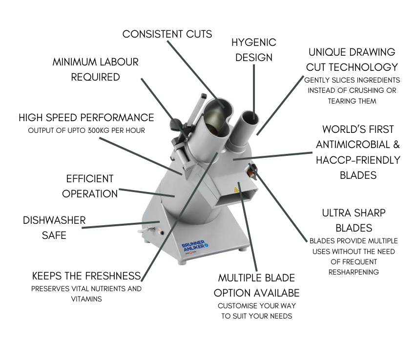 Advanced drawing cut technology ensures that each slice retains its natural nutrients, colour and texture, delivering consistently high-quality results. By minimising cell damage during processing, the Brunner Anliker XL C helps ingredients stay fresh for longer, preserving their flavour, appearance and nutritional value. Its precision cutting system, combined with a versatile range of inserts, allows even large volumes to be prepared without compromising quality, making it ideal for professional kitchens that demand efficiency without sacrificing product integrity. The result is food that not only looks and tastes exceptional but also maintains its healthful properties from prep to plate.