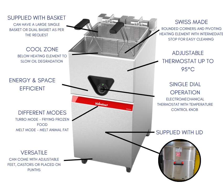 Engineered for high demand commercial kitchens, the Valentine Electric Deep Fryer 400T 18 Litre delivers exceptional performance, efficiency and reliability in one powerful unit. Designed with Swiss precision and built from a single pressed sheet of stainless steel, it ensures superior hygiene, durability and effortless cleaning - perfect for foodservice environments.