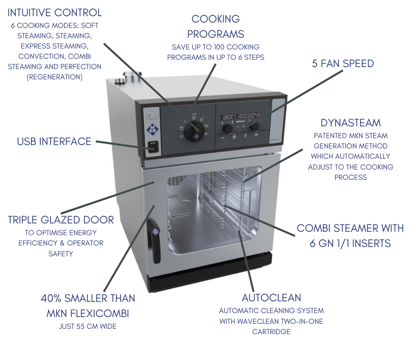 Despite being just 55 cm wide, the MKN SpaceCombi Classic delivers full professional combi-oven performance without compromise. Being 40% slimmer than MKN FlexiCombi, its compact footprint makes it ideal for kitchens where every centimetre counts, yet it still offers the same versatile cooking functions, high efficiency and robust output. From steaming and roasting to baking and grilling, the SpaceCombi Classic maximises productivity in even the smallest of spaces proving that powerful performance doesn't require a large kitchen.