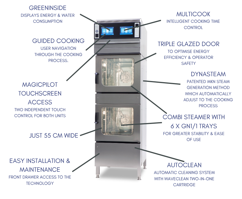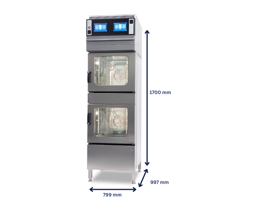 - Maximum Output in Minimal Space: Two powerful combi ovens stacked in one compact footprint (just 55cm wide) for ultimate space efficiency.