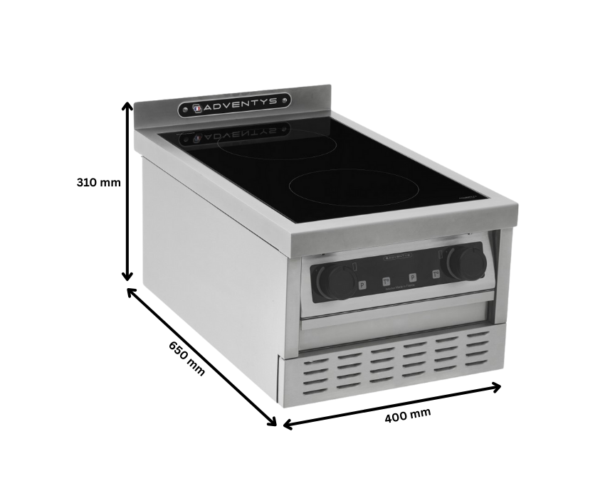 Designed for modern professional kitchens, the Adventys SK2i induction module delivers powerful performance in a sleek, compact format. Equipped with two high-efficiency 3000 W induction zones and a robust 6 mm vitro-ceramic glass surface, it offers rapid, precise cooking with power adjustment from 25 to 3600 W and temperature control from 30°C to 250°C.