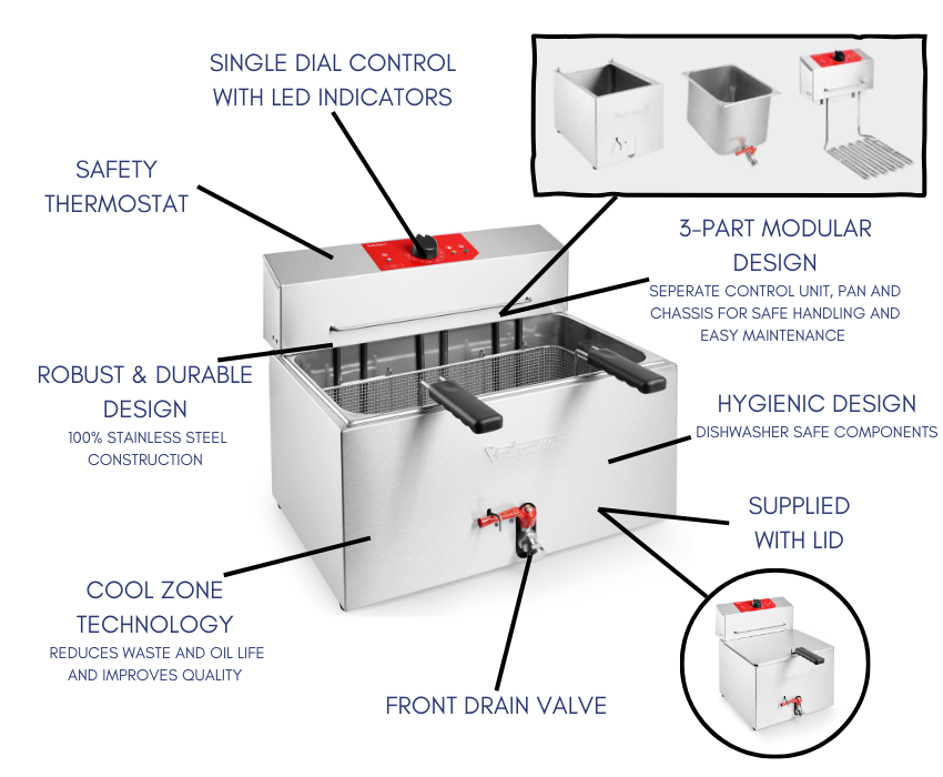 The Valentine TF13 Fryer features an integrated cool zone beneath the heating element, creating a cooler area that captures crumbs and food particles before they burn. This smart design helps extend oil life, reduce off-flavours and deliver consistently golden, crispy results. By preserving oil quality and minimising waste, the cool zone ensures smoother, more efficient kitchen operations while providing top notch frying performance service after service.