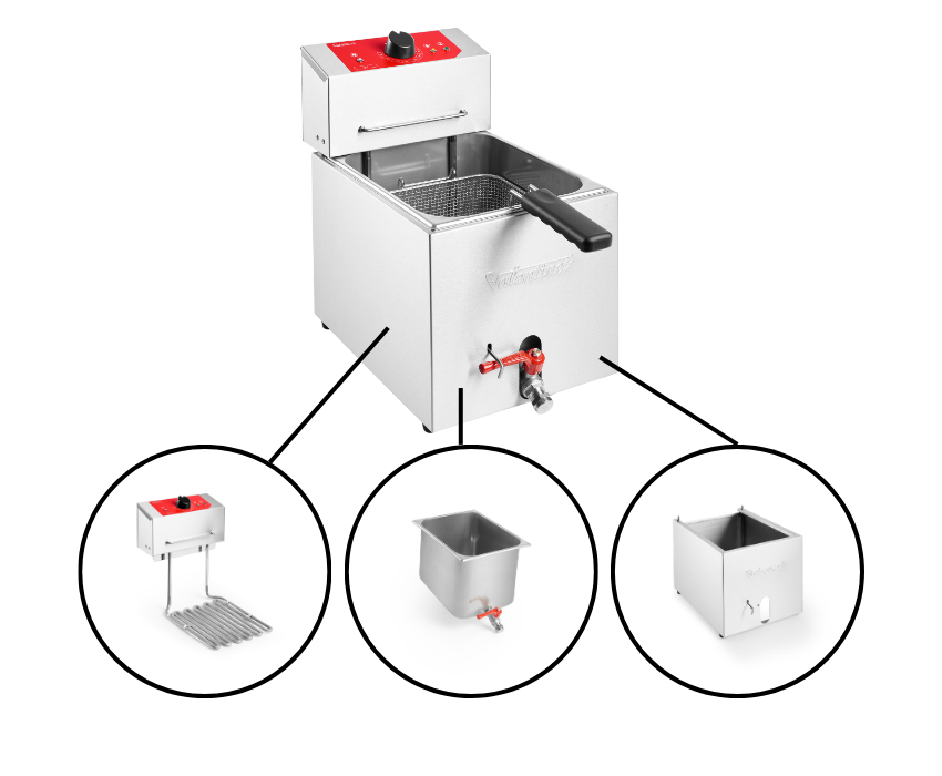 The Valentine TF7 Turbo Fryer features an intelligent 3-part modular construction, separating the control unit, pan and chassis to enhance operational safety and simplifying servicing. This smart design allows each component to be removed, handled and cleaned independently, reducing downtime and improving efficiency in fast-paced kitchen environments.
